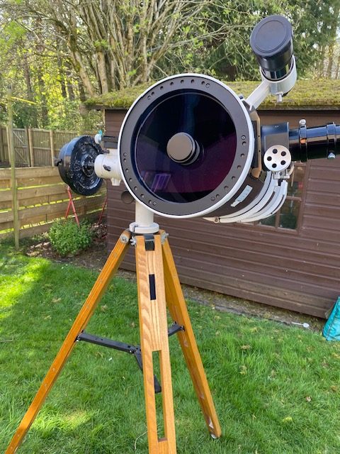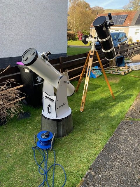 The telescope sits in the original lazy susan altazimuth mount with the stalks under its base fitting into some pre-cut holes I made in an inexpensive plastic water butt. This raises the height of the telescope further above the ground providing a supremely comfortable standing height – I’m a six footer – for all my astronomical observations. And that brings me to the second reason for abandoning refractors- I hate sitting down, huddling over an eyepiece, straining my back while trying to study a target located high in the sky. Those kinds of observations are much more comfortably executed while standing up. Indeed, I even use my travel scope- a high quality 130mm F/5 Newtonian placed on an altazimuth mount- in exactly the same way i.e. standing up. Once I got used to standing with my Newtonians, there was no going back to refractors.
