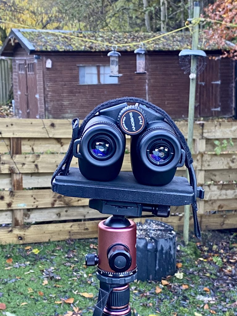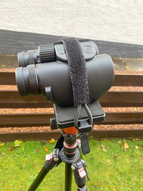 Because the SA208 imaging binocular does not have in-built stabilisation, capturing sharp hand-held shots is somewhat of a challenge, necessitating a steady hand. Placing it on a tripod alleviates this problem though. Svbony supply a good quality mounting bracket that screws into the front of the binocular bridge but I resorted to mounting it using velcro, as shown below: