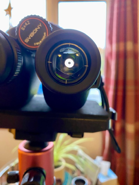 I shone a bright light from across my living room into the binocular to see how it would handle it. The image from the left barrel was clean and tidy with little or no internal reflections, with only a moderate diffraction spike. The view through right barrel produced a weird rainbow of colours, no doubt due to CMOS sensor placed in the optical train at the eyepiece end. This was an acceptable artefact given the nature of this binocular.
